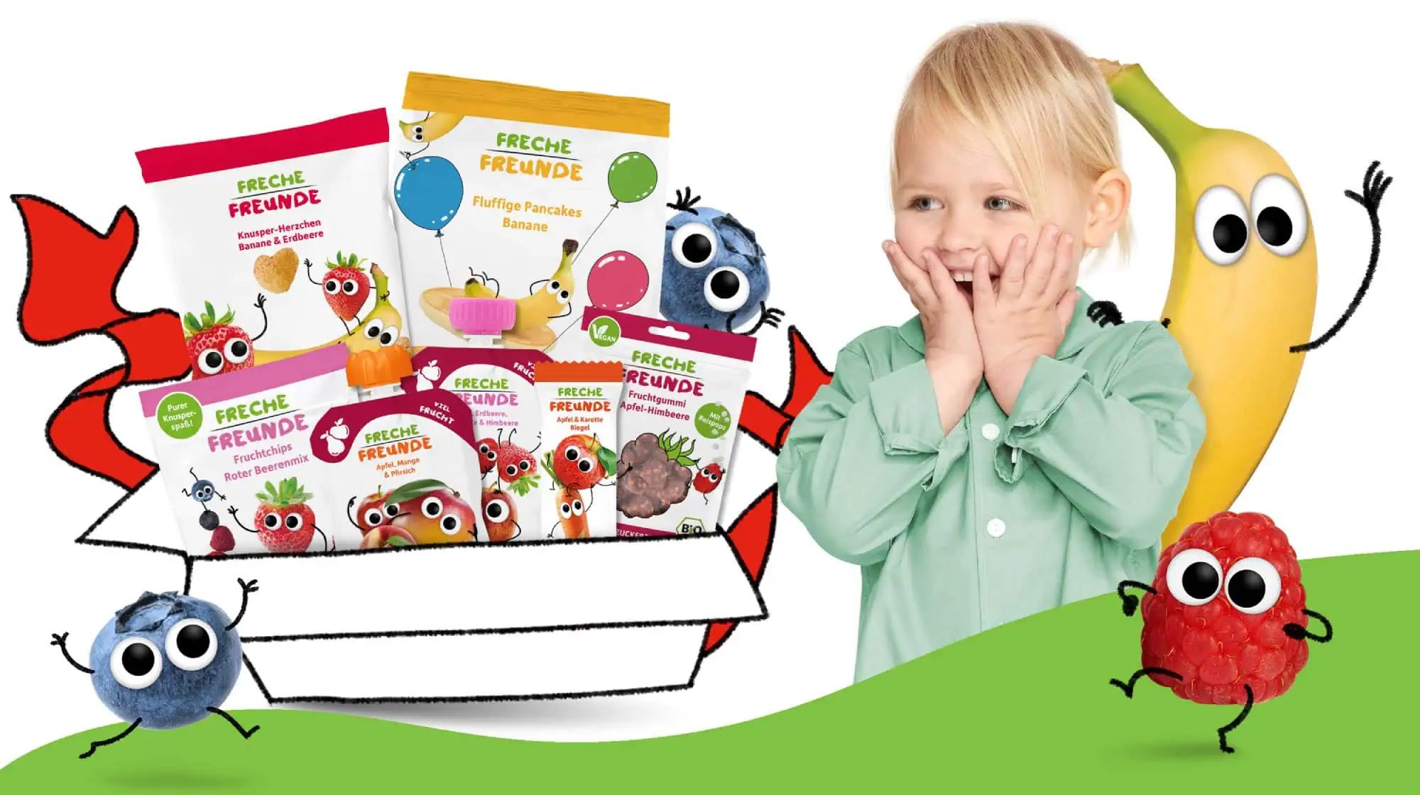 Kichern, knabbern, entdecken – kleine Frechdachse lieben Abenteuer und das macht hungrig! Freche Freunde bietet eine bunte Auswahl an fruchtig-gemüsigen Snacks für unterwegs oder zwischendurch. Ob Quetschies, Riegel, Fruchtchips oder herzhafte Knabbereien – die Snacks sind echt frech und echt lecker und perfekt für Kita, Spielplatz und Co.!